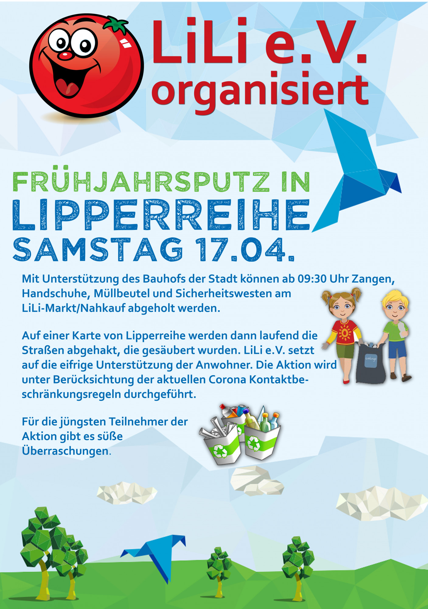 Der Frühjahrsputz muss sein, trotz Corona. Der LiLi e.V. organisiert daher auch dieses Jahr den Frühjahrsputz in Lipperreihe am Samstag 17. April 2021. Ein weiteres Jahr in Folge ohne Frühjahrsputz soll es nicht geben. Ab 09:30 Uhr können Zangen, Handschuhe, Müllbeutel und Sicherheitswesten am LiLi-Markt/nahkauf bei der Einsatzleitung – mit Abstand und unter Einhaltung der Hygienebestimmungen – abgeholt werden. Gruppen dürfen nur in der (tagesaktuell) erlaubten Größe und aus einem Haushalt gemeinsam losgehen.